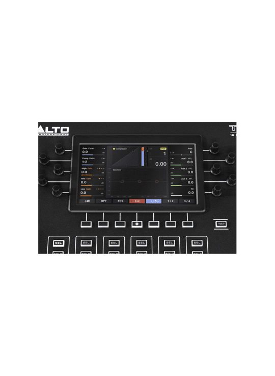 De Alto TMD16 maakt gebruik van speciale drukknop encoders en verlichte drukknoppen naast en onder het 7" kleurendisplay om snel je equalizer of je compressor aan te passen en met de touchfaders bedien je snel je volumes.