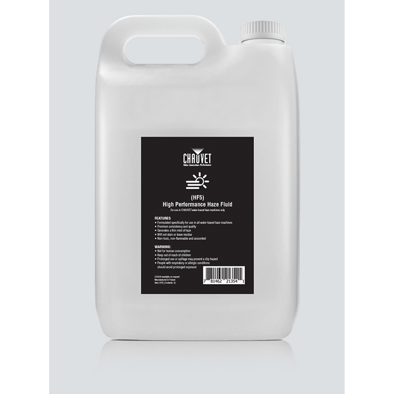 De Chauvet DJ High Performance Haze vloeistof HF5 laat geen residu of vlekken achter, wordt in Frankrijk geproduceerd en is niet giftig of geparfumeerd en uiteraard niet ontvlambaar.